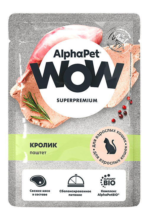 Влажный полнорационный корм для взрослых кошек паштет с кроликом AlphaPet WOW Superpremium