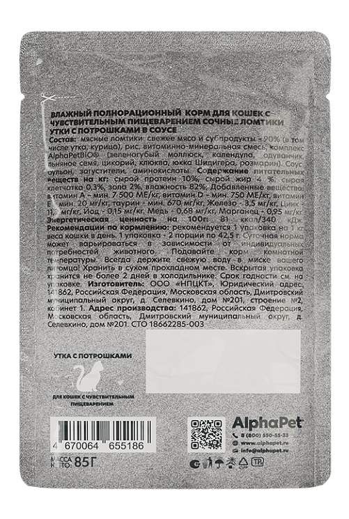 Влажный полнорационный корм для кошек с чувствительным пищеварением сочные ломтики утки с потрошками в соусе AlphaPet WOW Superpremium