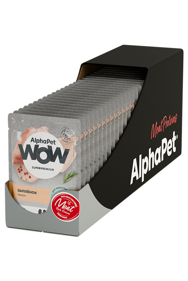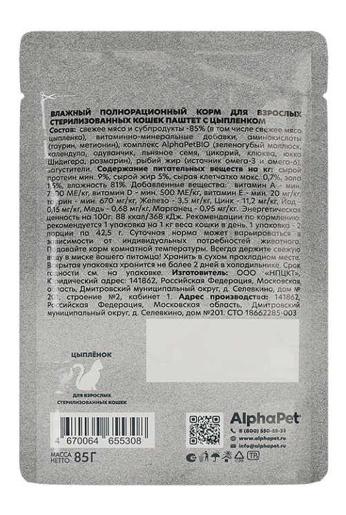 Влажный полнорационный корм для взрослых стерилизованных кошек паштет с цыпленком AlphaPet WOW Superpremium