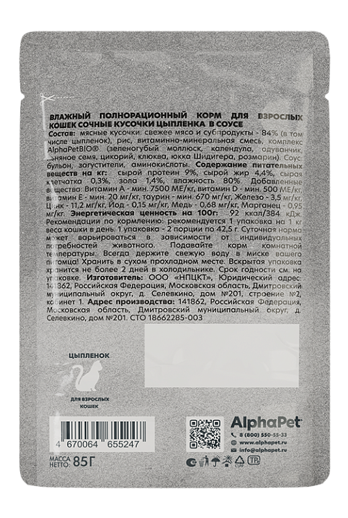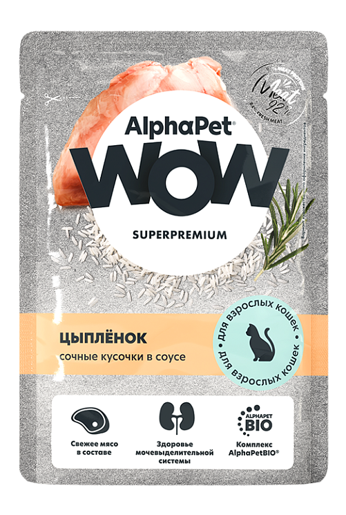 Влажный полнорационный корм для взрослых кошек сочные кусочки цыпленка в соусе AlphaPet WOW Superpremium