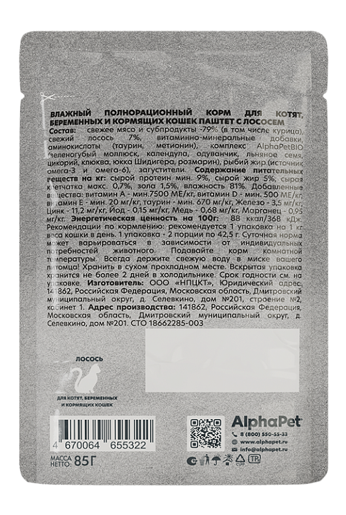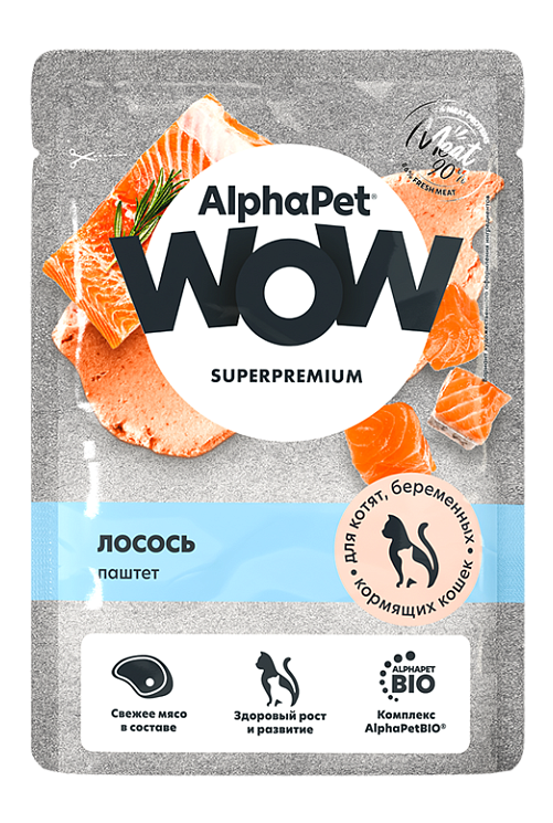 Влажный полнорационный корм для котят, беременных и кормящих кошек паштет с лососем AlphaPet WOW Superpremium