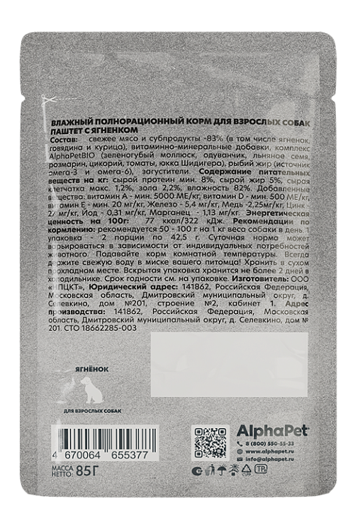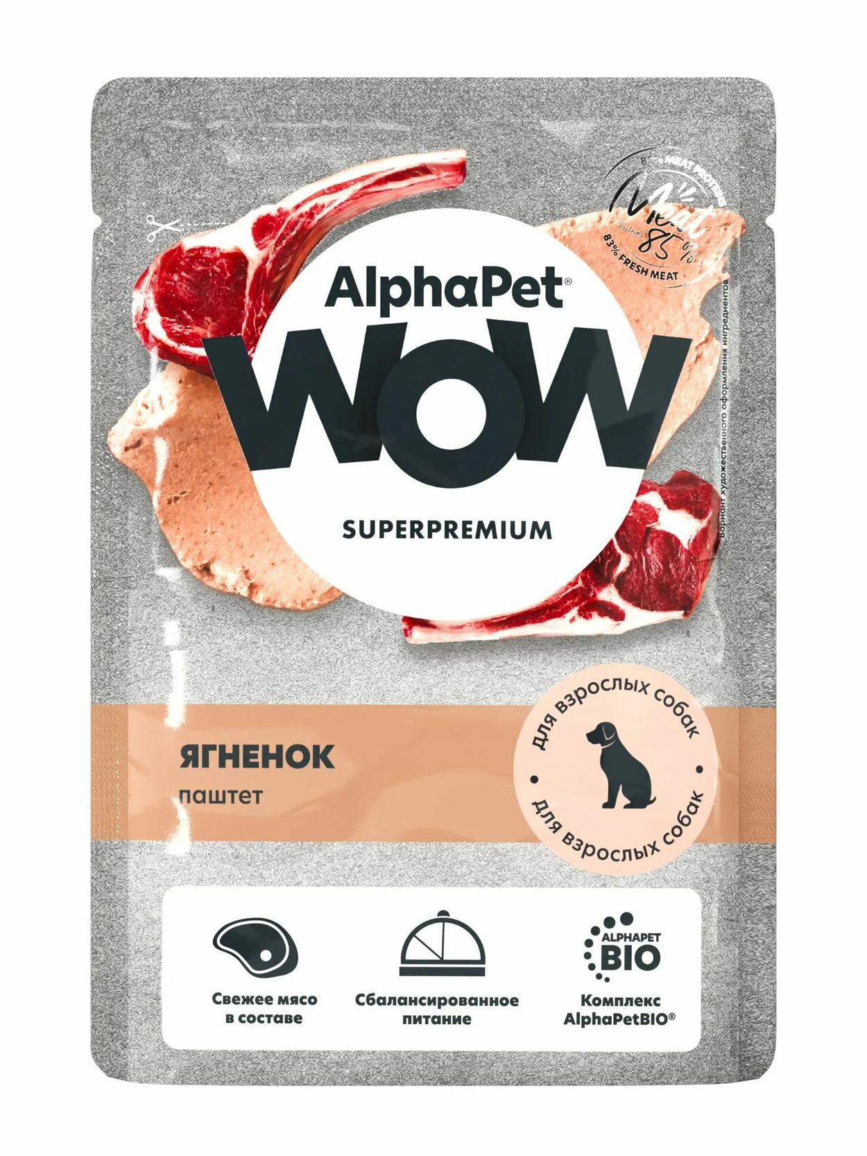 Влажный полнорационный корм для взрослых собак паштет с ягненком AlphaPet WOW Superpremium