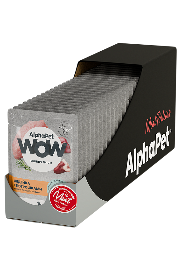 Влажный полнорационный корм для щенков, беременных и кормящих собак нежные ломтики индейки с потрошками в соусе AlphaPet WOW Superpremium