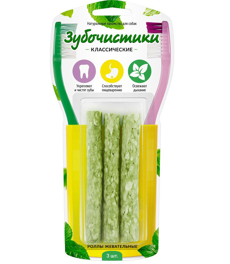Жевательные роллы для собак - это приятное и полезное лакомство для вашего домашнего любимца. Их особая структура позволяет сделать чистку зубов максимально эффективной, которую можно сравнить с механической. Разжёвывание пластинок очищает зубы собаки и массирует десна, а выделение слюны помогает убирать остатки пищи и удалять их с зубов. Постоянное применение жевательных палочек-роллов снижает возможность образования зубного камня и предотвращает заболевания полости рта. Высокое содержание кальция в лакомстве способствует укреплению костей и зубов питомца. Отсутствие ингредиентов искусственного происхождения делает палочки легко усваиваемыми. В упаковке можно найти 3 вкусных палочек-зубочисток для собак.