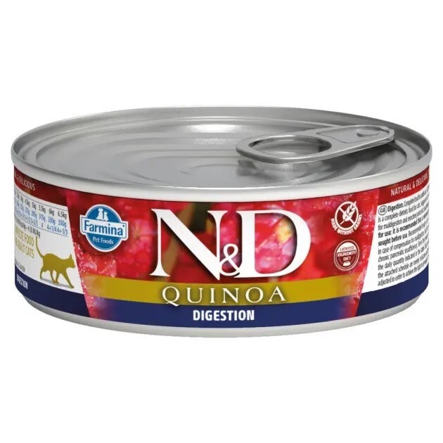 N&D Quinoa Digestion диетический полнорационный влажный корм для взрослых кошек, рекомендуемый при нарушениях переваривания и при экзокринной недостаточности поджелудочной железы.
