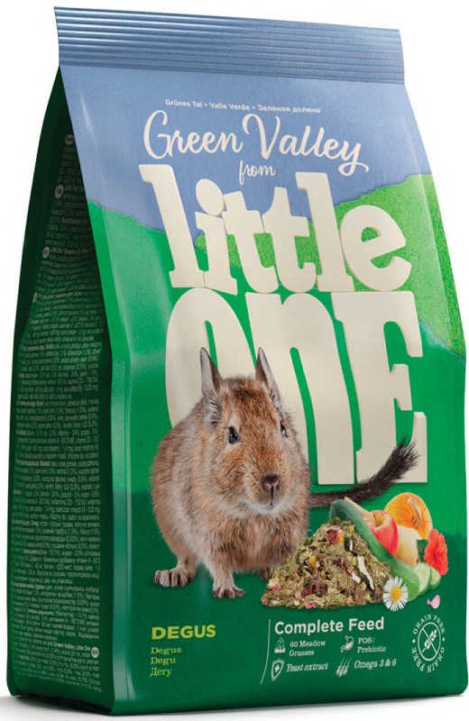 Little One корм из разнотравья «Зеленая долина» — корм для декоративных животных, в состав которого входит 60 разновидностей трав. Изготовленный с помощью специальной технологии холодного прессования, корм сохранил все витамины, минералы и другие ценные питательные вещества, входящие в состав растений. Корм богат длинными волокнами клетчатки, что обеспечит необходимый уход за зубами и правильное пищеварение у дегу.