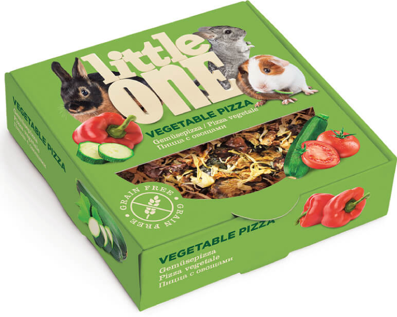 Овощная пицца Little One приготовлена специально для декоративных животных. Основа пиццы изготовлена из ароматных луговых трав, а топпинг состоит из лепестков календулы и сушеных овощей. Пицца не содержит зерен, сахаров, консервантов и красителей. Такой состав делает пиццу настоящим удовольствием для домашних питомцев, а также источником витаминов и других питательных веществ. Форма пиццы очень удобна для разгрызания, что способствует стачиванию постоянно растущих зубов у грызунов и кроликов.