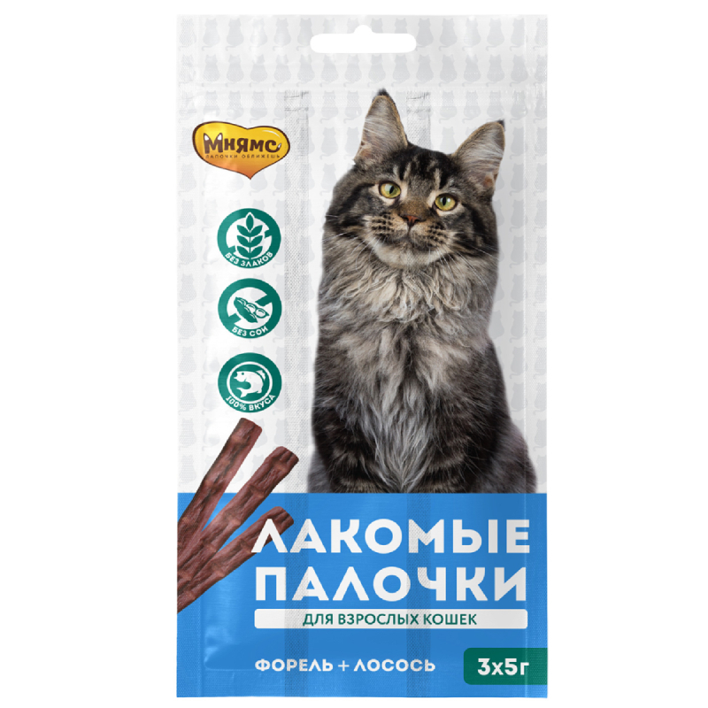 Мнямс лакомые палочки для кошек с лососем и форелью станут любимым угощением для вашего питомца. Кроме того, что каждая палочка содержит высококачественные морепродукты, в ее состав также входят и продукты растительного происхождения, которые гарантировано подарят кошке здоровый вид.