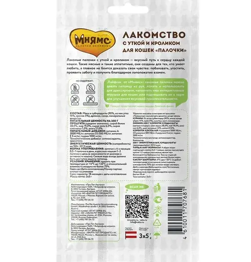 Мнямс - палочки для кошек с уткой и кроликом – придутся по вкусу даже самым привередливым кошечкам. Их состав разработан с учетом всех потребностей кошки, а также обогащен витаминами группы А, D, Е, которые принесут пользу здоровью вашего любимца. Содержит антиоксиданты.
