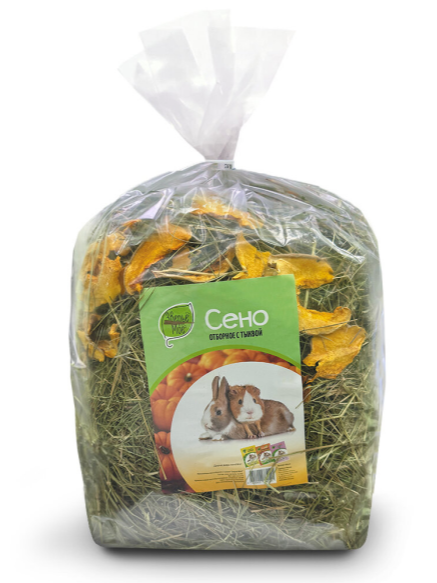 Сено с тыквой — вкусно, полезно и увлекательно! Луговое сено с тыквой «Зверьё Моё» — это отборная зелёная трава, обогащённая кусочками сушеной тыквы. Подходит для шиншилл, морских свинок, кроликов и других травоядных как ежедневный корм, подстилка и источник естественного поведения: жевания, копания и поиска лакомств.