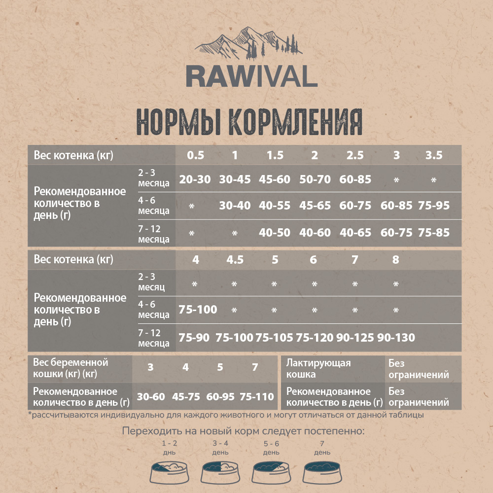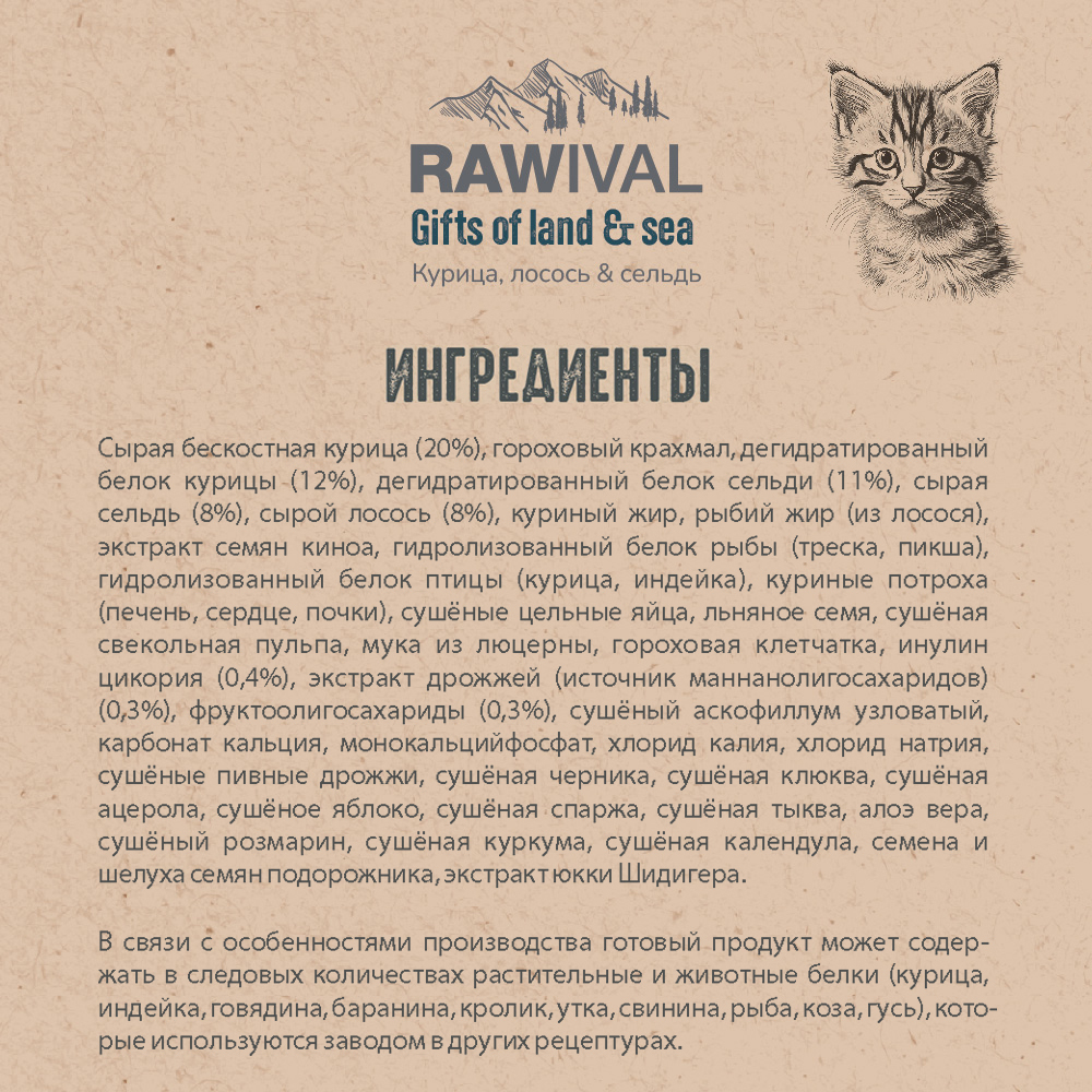 Полнорационный сухой корм ультрапремиум-класса на основе курицы, сельди и лосося для котят. Высокое содержание белка из свежей рыбы и мяса птицы, отсутствие злаков и натуральные необработанные ингредиенты делают Rawival питанием, предназначенным самой природой.