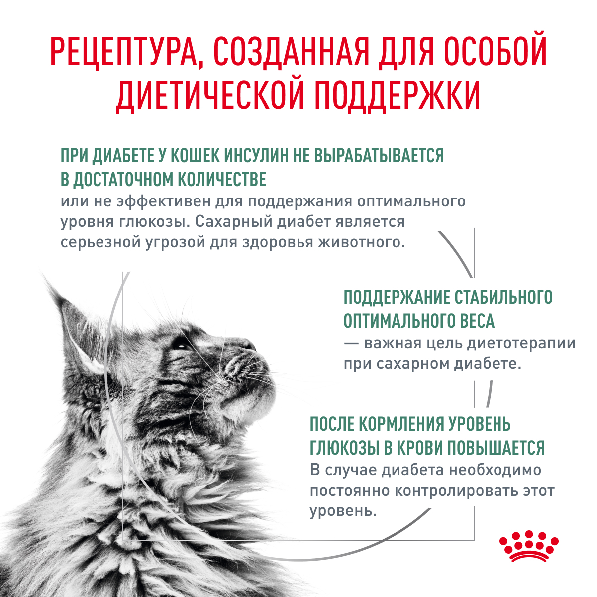 Сухой корм ROYAL CANIN® DIABETIC (ДИАБЕТИК) - полнорационный диетический корм для взрослых кошек, разработанный для регулирования уровня глюкозы в крови при сахарном диабете. Корм с пониженным содержанием быстроусвояемых углeводов. Специальная формула продукта, обеспечивающая контроль уровня постпрандиальной гликемии у кошек больных диабетом. Умеренная калорийность позволяет бороться с избыточным весом