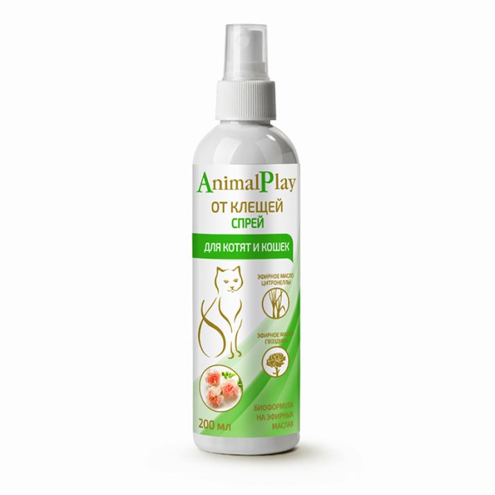 Animal Play Спрей репеллентный для котят и кошек специально разработан для отпугивания эктопаразитов (клещей, блох, власоедов) и летающих кровососущих насекомых.