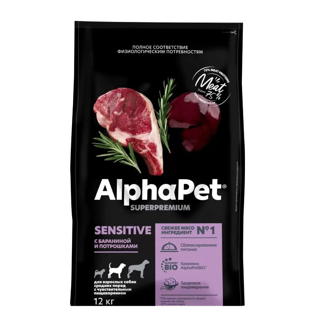 Сухой корм ALPHAPET Superpremium для взрослых собак средних пород с чувствительным пищеварением, с бараниной и потрошками - 12 кг (арт. 83913)