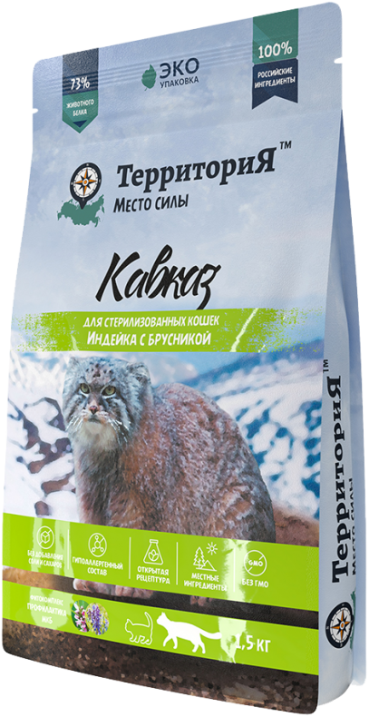 Сухой корм ТЕРРИТОРИЯ Кавказ для стерилизованных кошек с индейкой и брусникой - 1,5 кг (арт. 5114П)