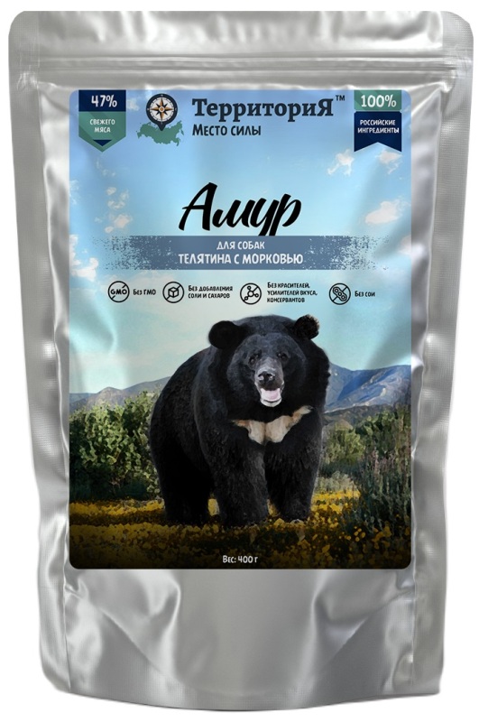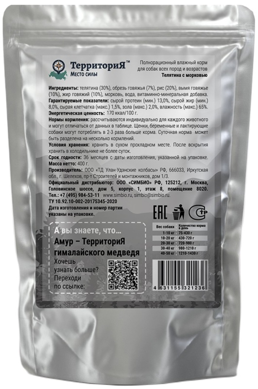 Телятина (30%), обрезь говяжья (7%), рис (20%), вымя говяжье (10%), жир говяжий (10%), морковь, вода, витаминно-минеральная добавка.