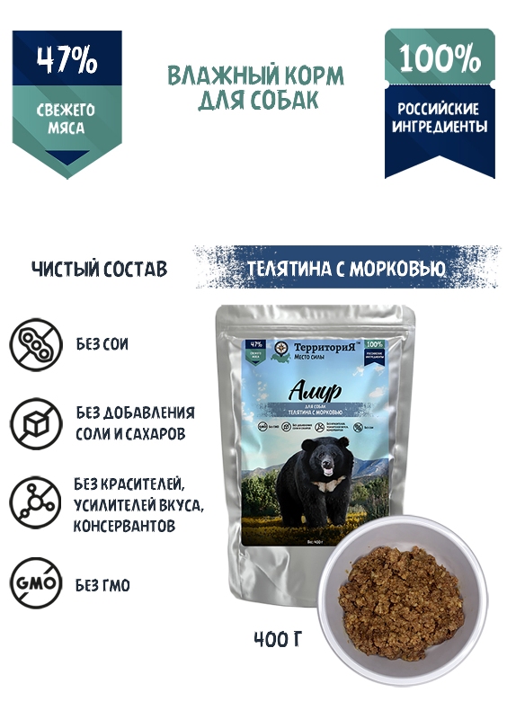 Влажный корм суперпремиум класса. Содержит 50% свежего мяса. Состав корма включает в себя лишь те продукты, которые используются в натуральном питании животных. Основные ингредиенты корма – телятина, говядина и рис. Консервы не содержат желирующих добавок, искусственных красителей, растительного масла и соли. Щадящая технология производства позволяет сохранить богатый вкус свежего мяса. Консервы готовят в собственном соку непосредственно в реторт-пакете, поэтому они получаются сочными, нежными и ароматными, как если бы вы сделали их дома.