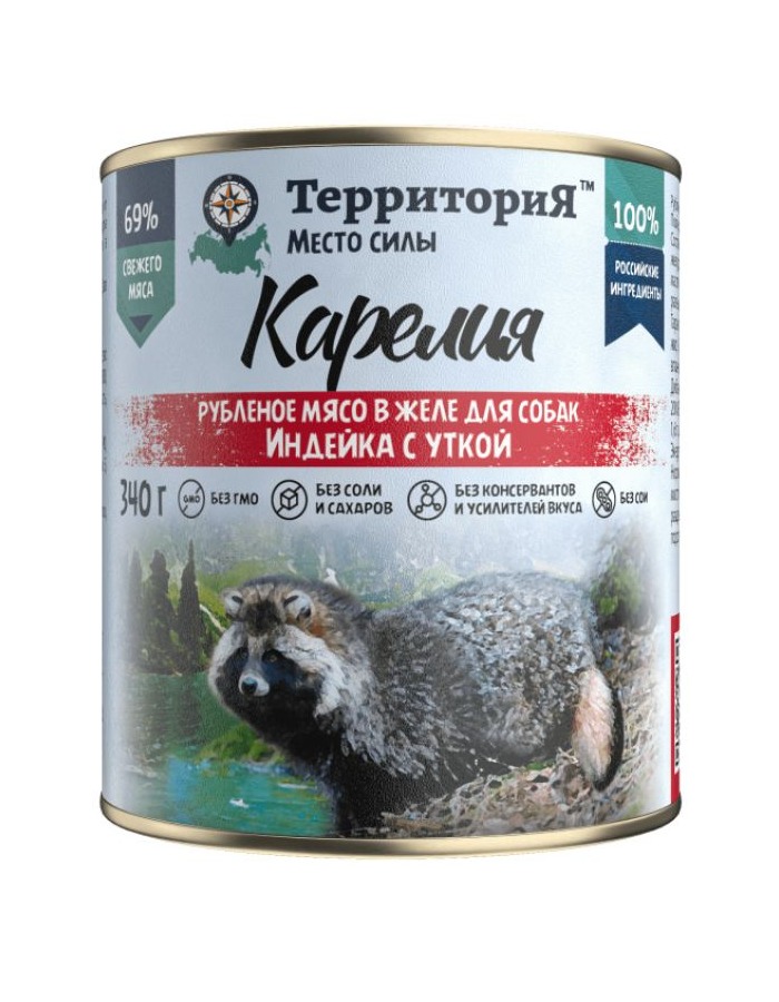 Филе индейки (45%), сердце индейки (10%), желудок индейки (10%), филе утки (4%), хлопья овсяные, масло льняное, брусника сушёная, витаминно-минеральный комплекс, натуральная желирующая добавка.