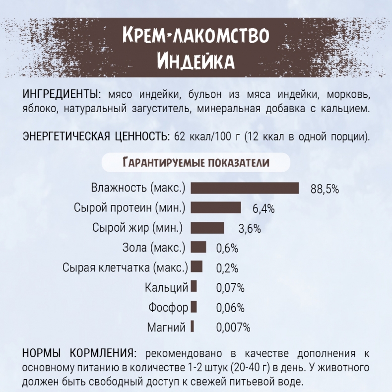 Мясо индейки, бульон из мяса индейки, морковь, яблоко, натуральный загуститель, минеральная добавка с кальцием.