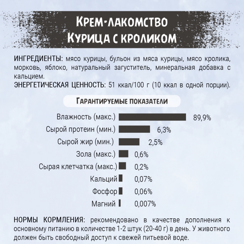 Мясо курицы, бульон из мяса курицы, мясо кролика, морковь, яблоко, натуральный загуститель, минеральная добавка с кальцием.