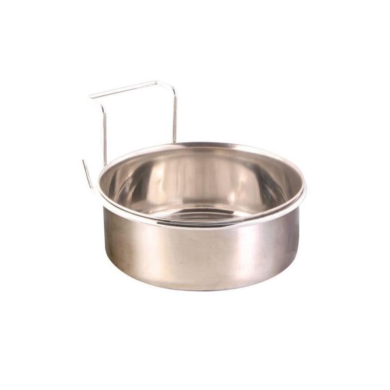Миска из нержавеющей стали для птиц с хромированным держатилем.