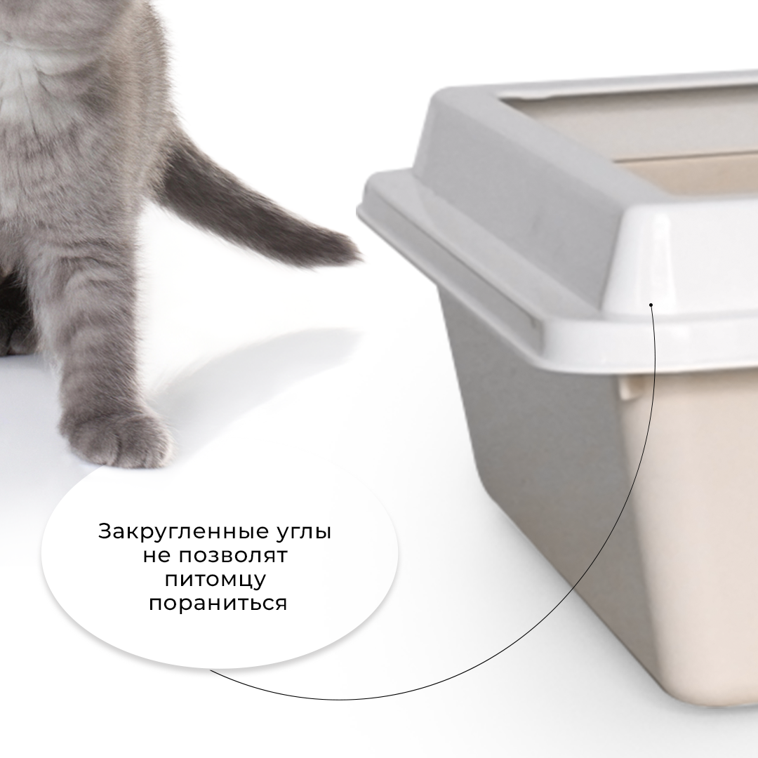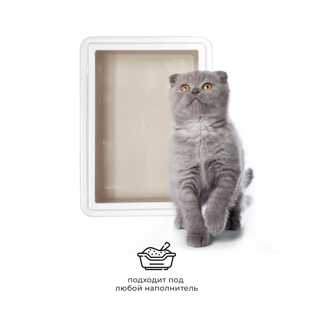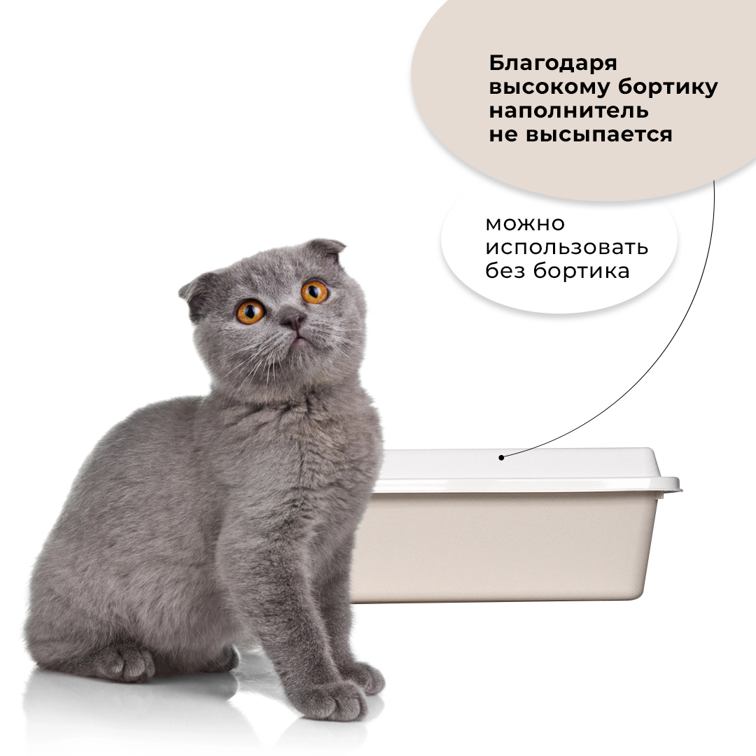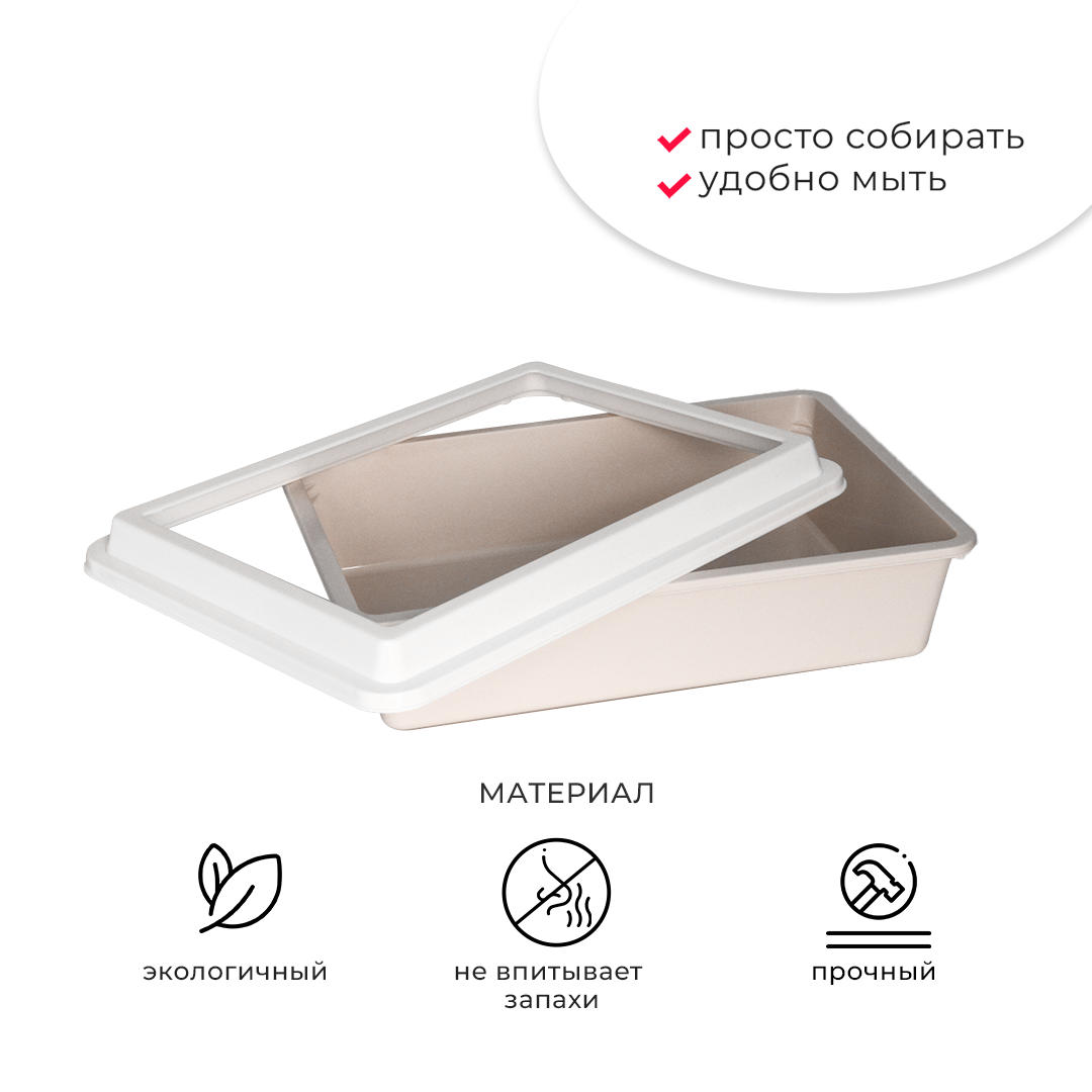 Лоток открытого типа со съемной рамкой. Благодаря высокому борту, наполнитель не разбрасывается по комнате, а остаётся в лотке.