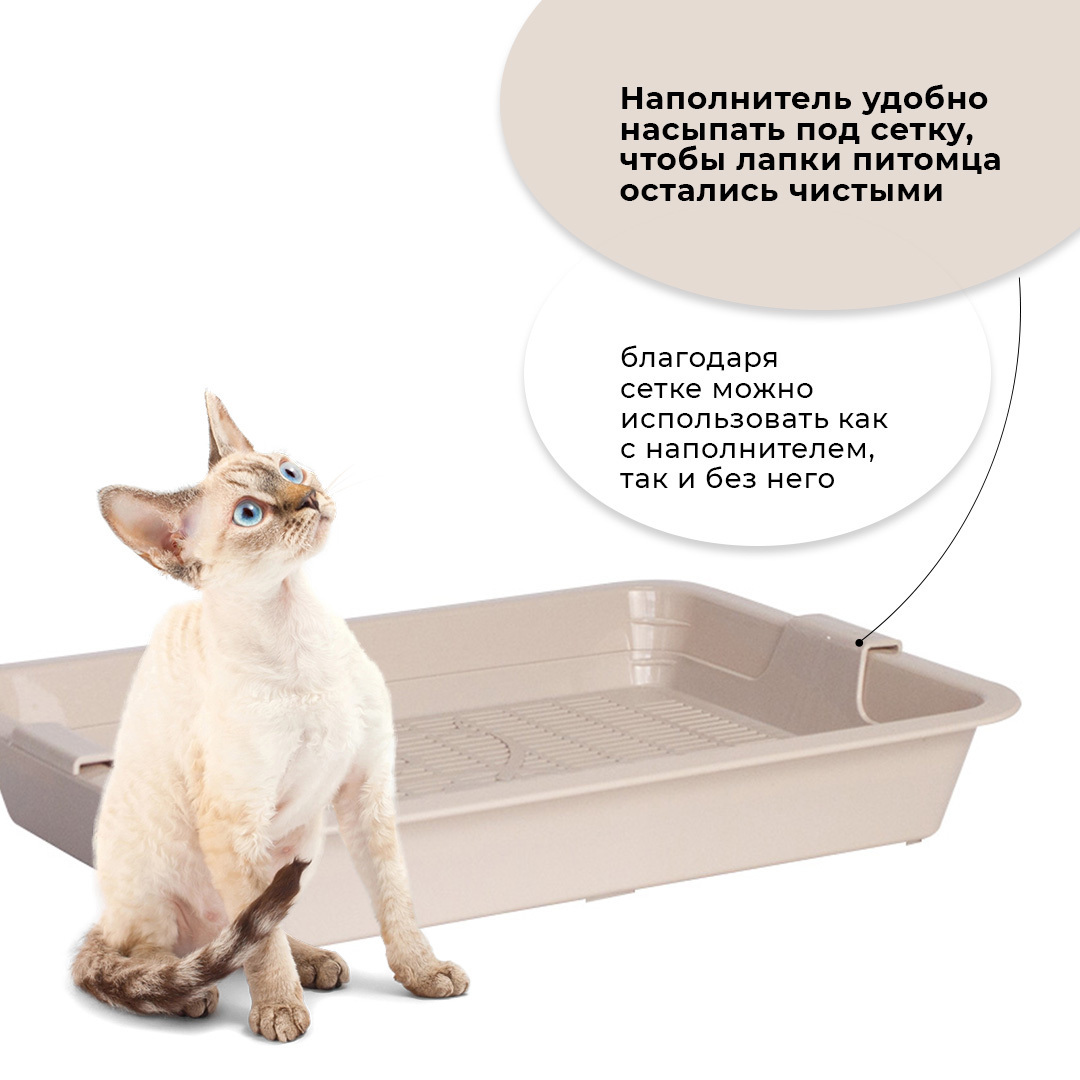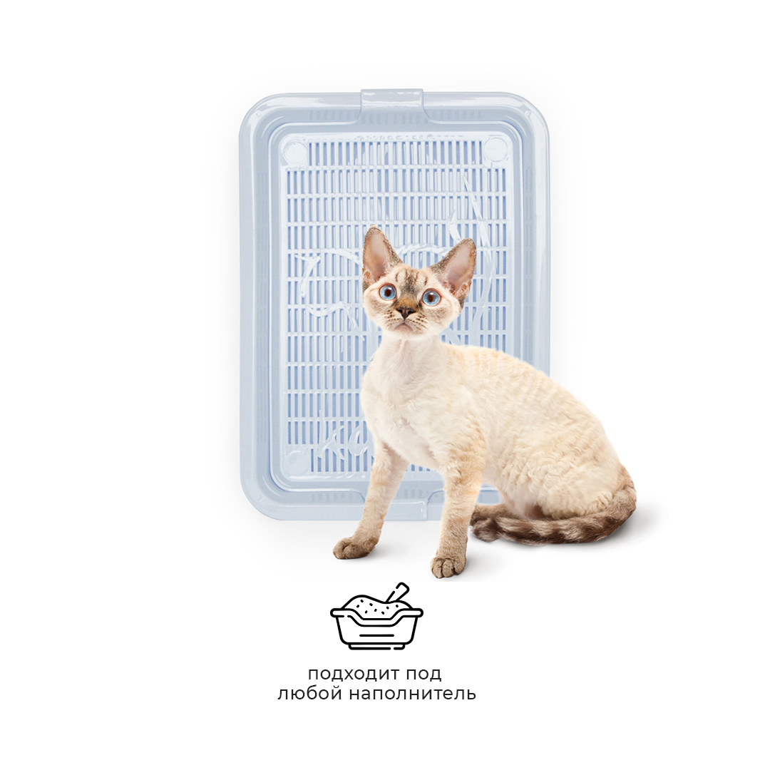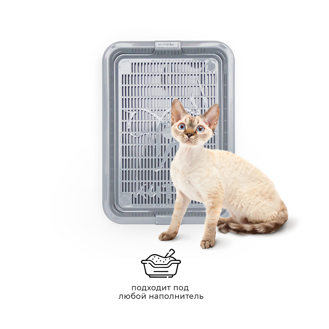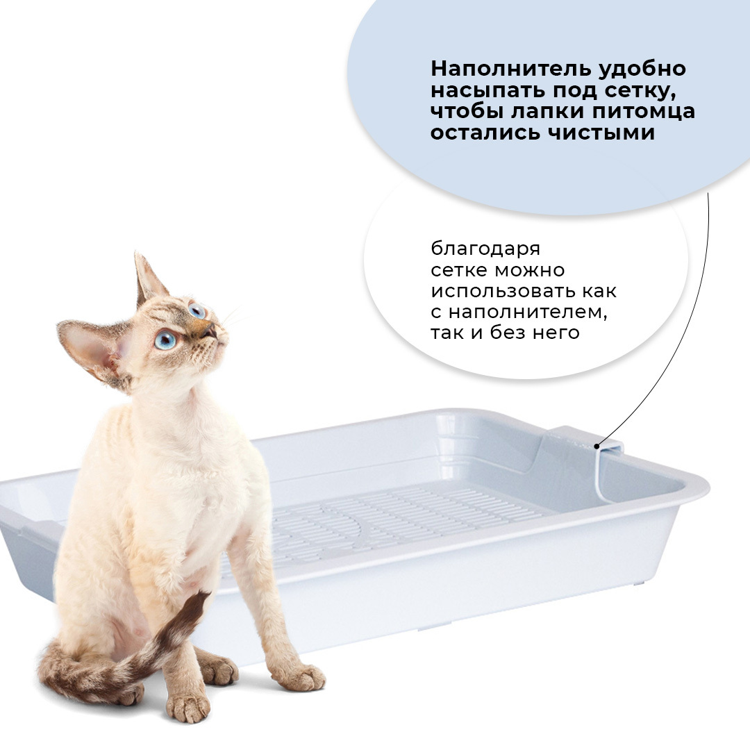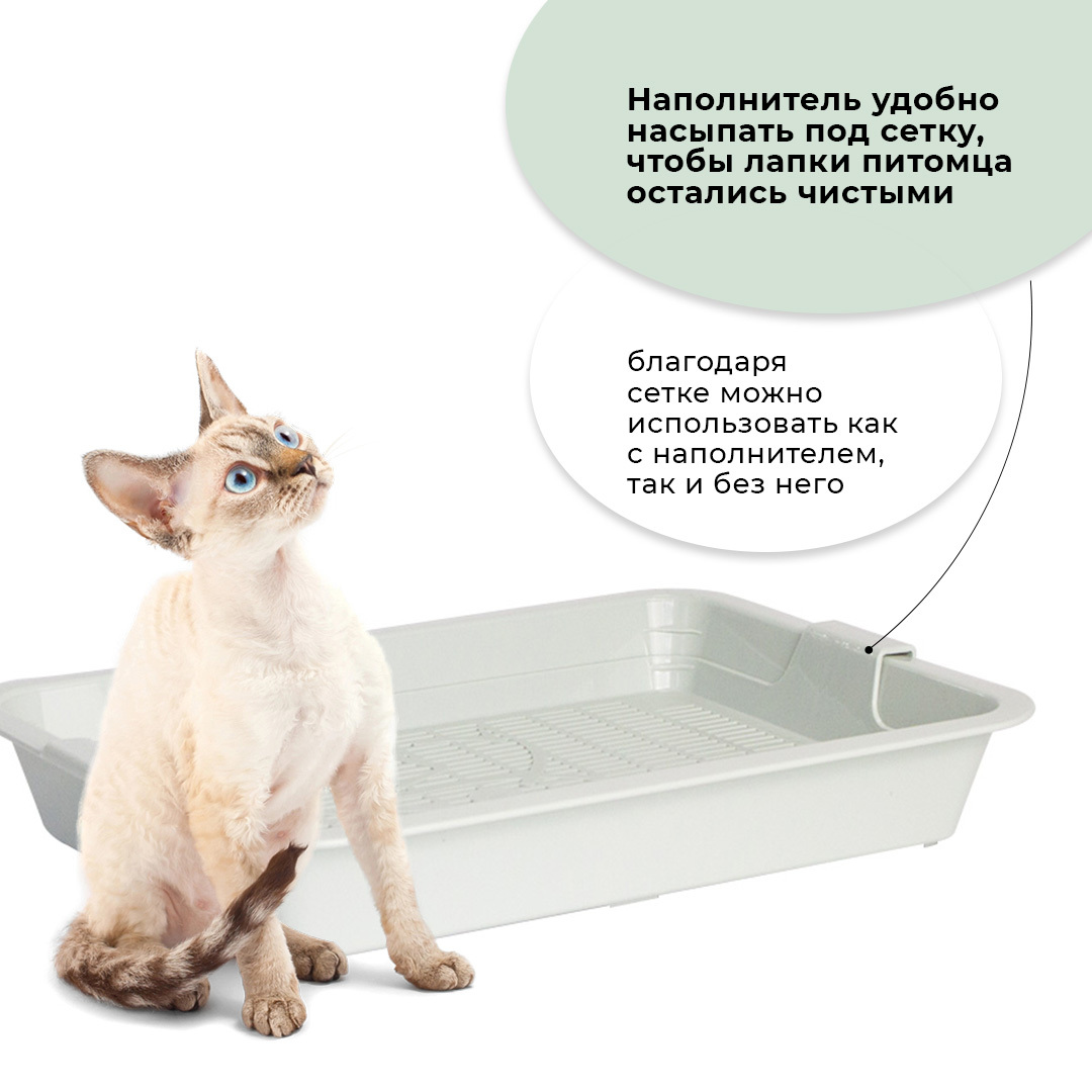 - Лоток с сеткой помогает питомцу не раскидывать наполнитель вокруг туалета, так как наполнитель находится внутри, под решеткой;
