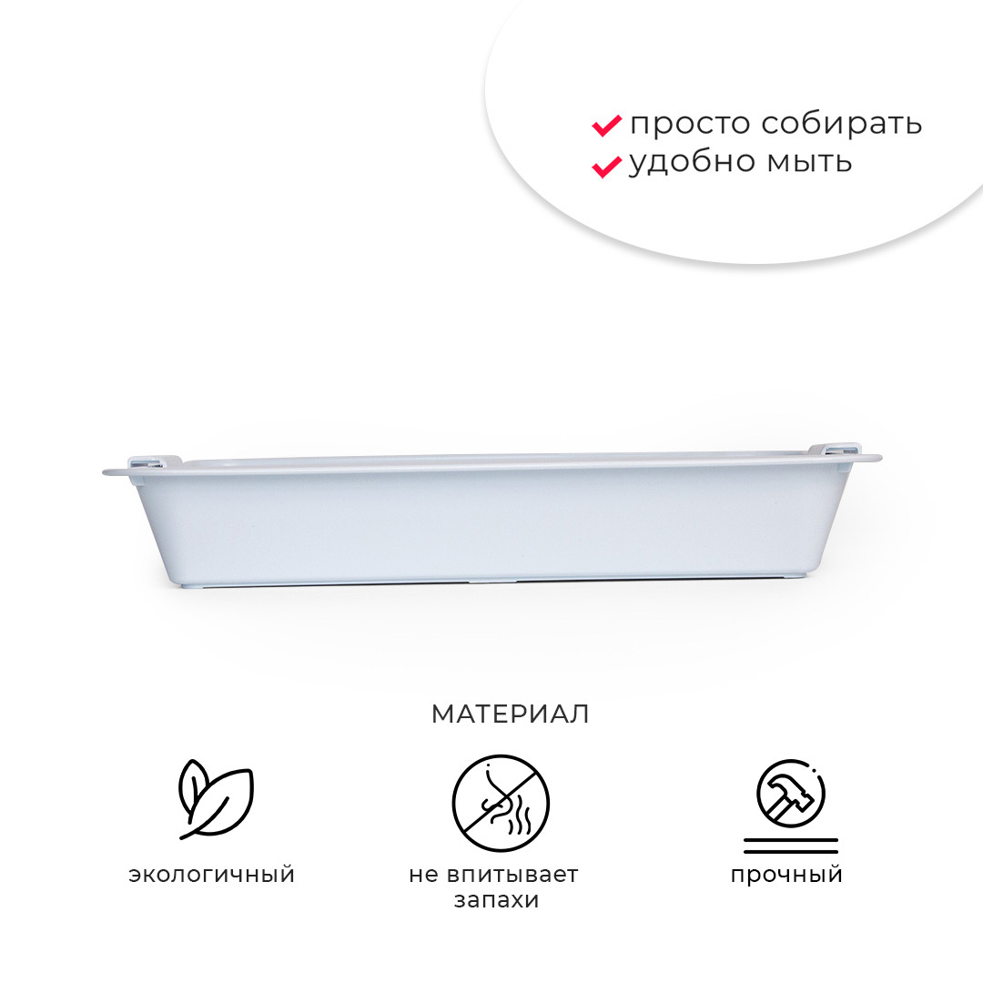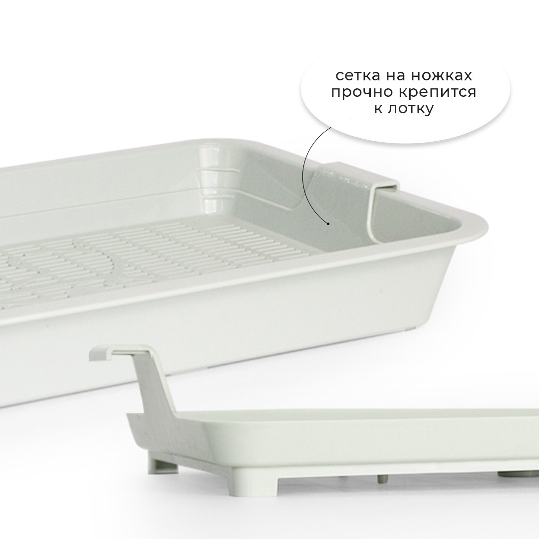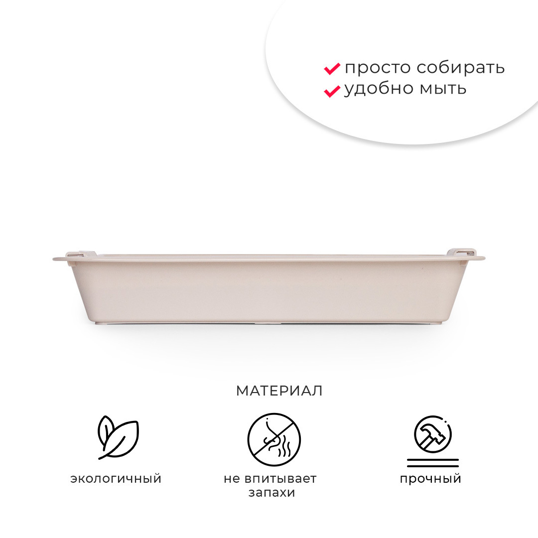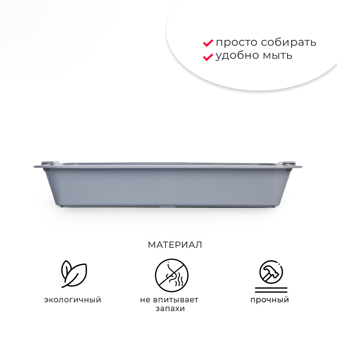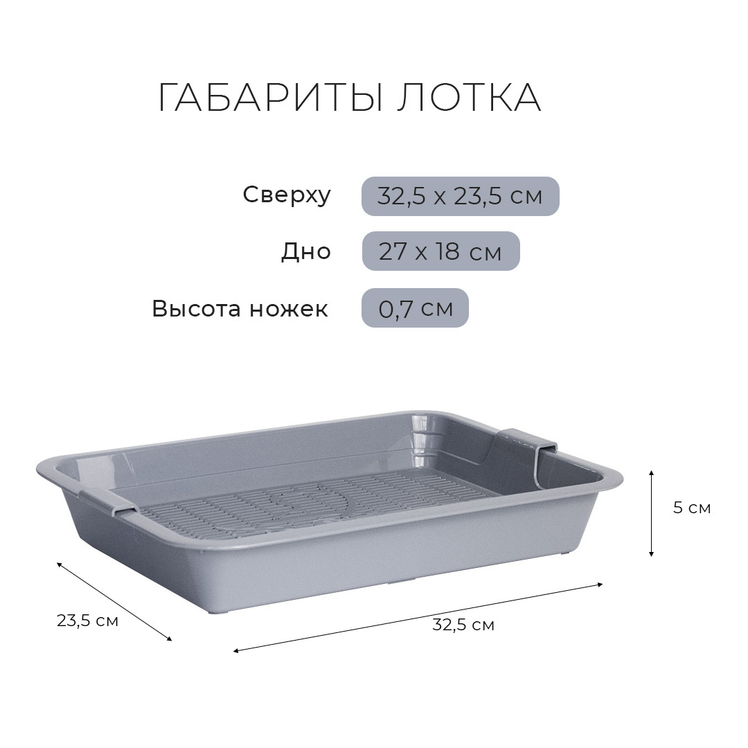 - Лоток с сеткой помогает питомцу не раскидывать наполнитель вокруг туалета, так как наполнитель находится внутри, под решеткой;