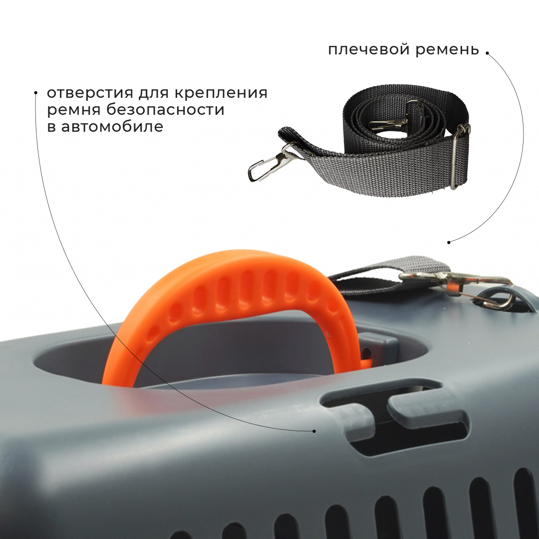 Переноска оснащена плечевым ремнем, предусмотрены отверстия для крепления ремня безопасности в автомобиле.