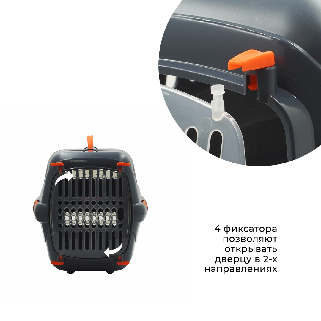 Переноска также оснащена усиленным креплением 5-ю боковыми клипсами, которые прочно соединяют две части переноски и не дают питомцу выпасть. Благодаря им переноска легко разбирается и собирается, а ее чистка не требует особых усилий. Прозрачная пластиковая дверца закреплена 4-мя поворотными фиксаторами, которые позволяют открывать ее в горизонтальном направлении, как слева-направо, так и справа-налево.